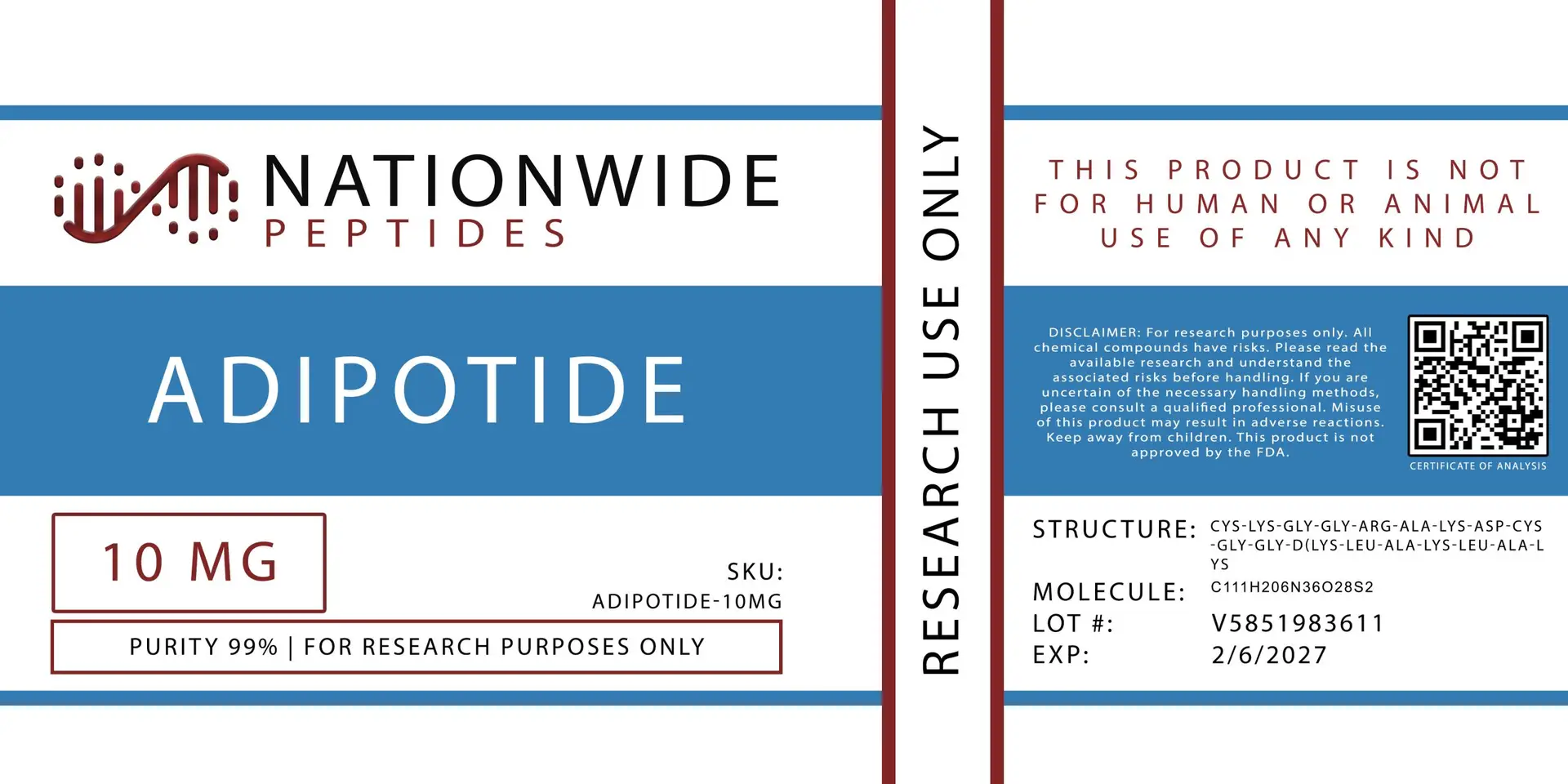 According to published preclinical literature, Adipotide is theorized to trigger apoptosis of white adipose vasculature following internalization. Research on obese primate models has been published in peer-reviewed journals (pmc.ncbi.nlm.nih.gov). This research-grade lyophilized peptide is synthesized under strict quality controls and is accompanied by full analytical documentation, making it a tool for adipose vasculature biology and related in vitro research.