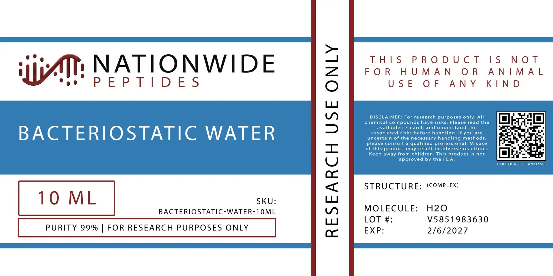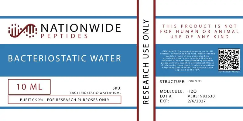 Bacteriostatic Water is a sterile solvent for reconstituting lyophilized research peptides. The addition of 0.9% (9 mg/mL) benzyl alcohol inhibits bacterial growth, allowing multiple withdrawals from the same vial for up to 28 days while maintaining sterility, as specified by USP standards (dailymed.nlm.nih.gov).