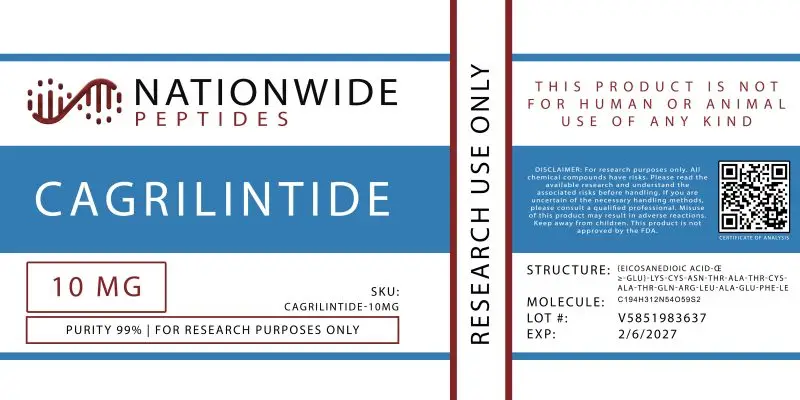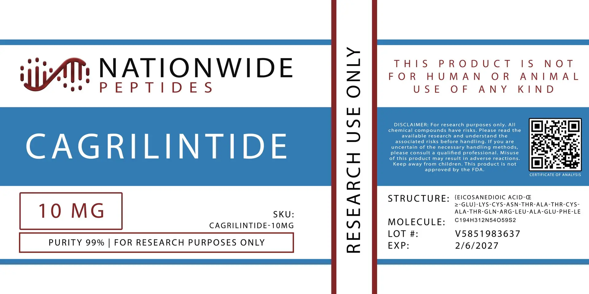 Cagrilintide is an investigational long-acting amylin receptor agonist and amylin analog for research use only. It is designed to mimic the pancreatic hormone amylin by activating calcitonin/amylin receptors in the area postrema and hypothalamus. This research-grade lyophilized powder is synthesized under strict quality controls and provided with full analytical documentation.