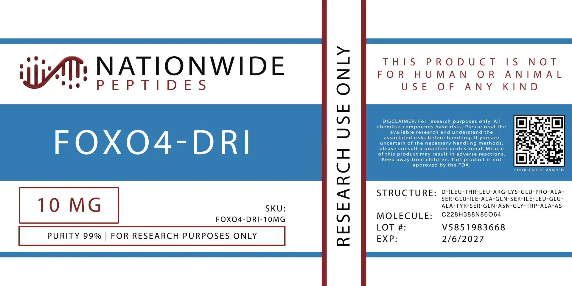 FOXO4-DRI is a D-amino acid retro-inverso peptide developed by Peter de Keizer’s group at Erasmus MC. It is designed to selectively disrupt the FOXO4-p53 interaction in senescent cells, enabling their targeted clearance while sparing healthy cells in preclinical models. First published in Cell (2017), this peptide has been studied in the context of senolytics, cellular senescence, and longevity research. This research-grade lyophilized peptide is synthesized under strict quality controls and provided with full analytical documentation. For Research Use Only. Not for human use.
