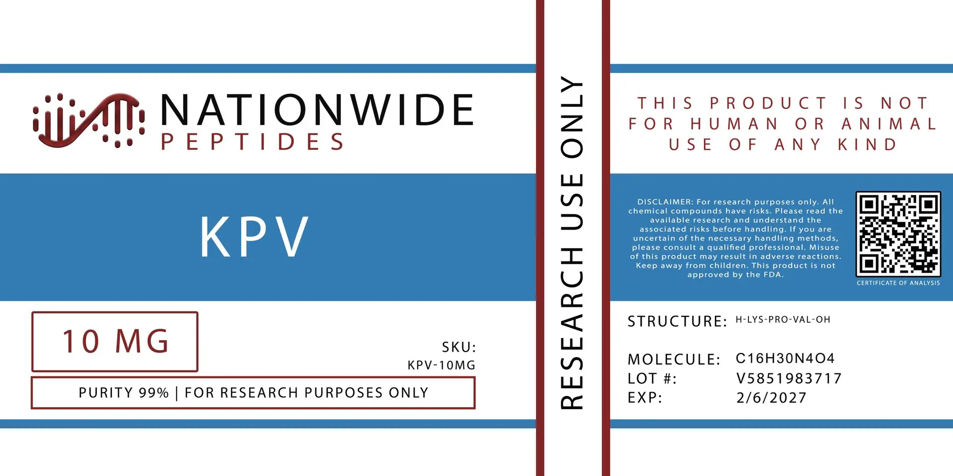KPV is a short synthetic tripeptide extensively used in pre-clinical research to investigate intracellular anti-inflammatory signaling, PepT1-mediated uptake in intestinal cells, and suppression of pro-inflammatory cascades in epithelial and immune models. This research-grade peptide is produced under stringent GMP-compliant conditions and provided as a lyophilized powder to ensure superior purity, stability, and reliability in experimental applications.