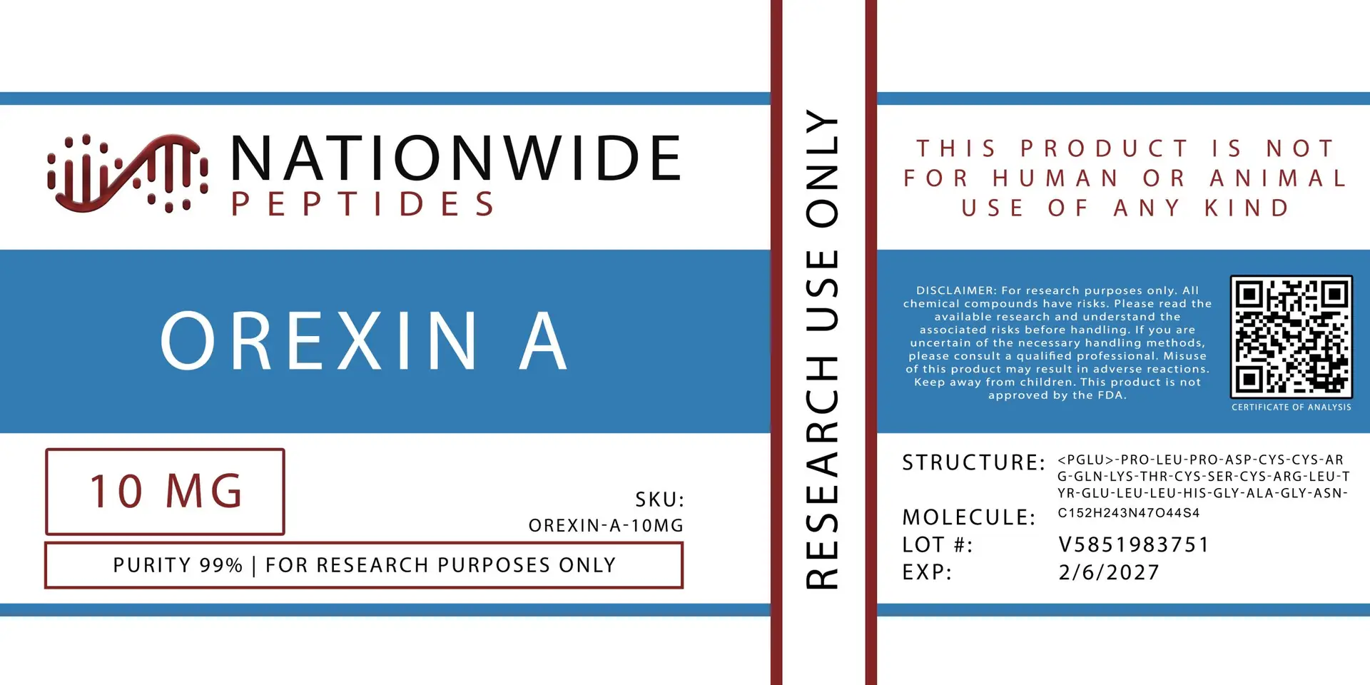 Engineered solely for preclinical investigations, each batch of Orexin A undergoes a comprehensive quality assessment and includes complete documentation, including a Certificate of Analysis (COA), purity data, and structural verification.