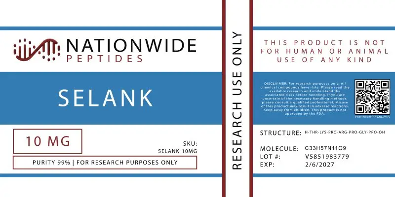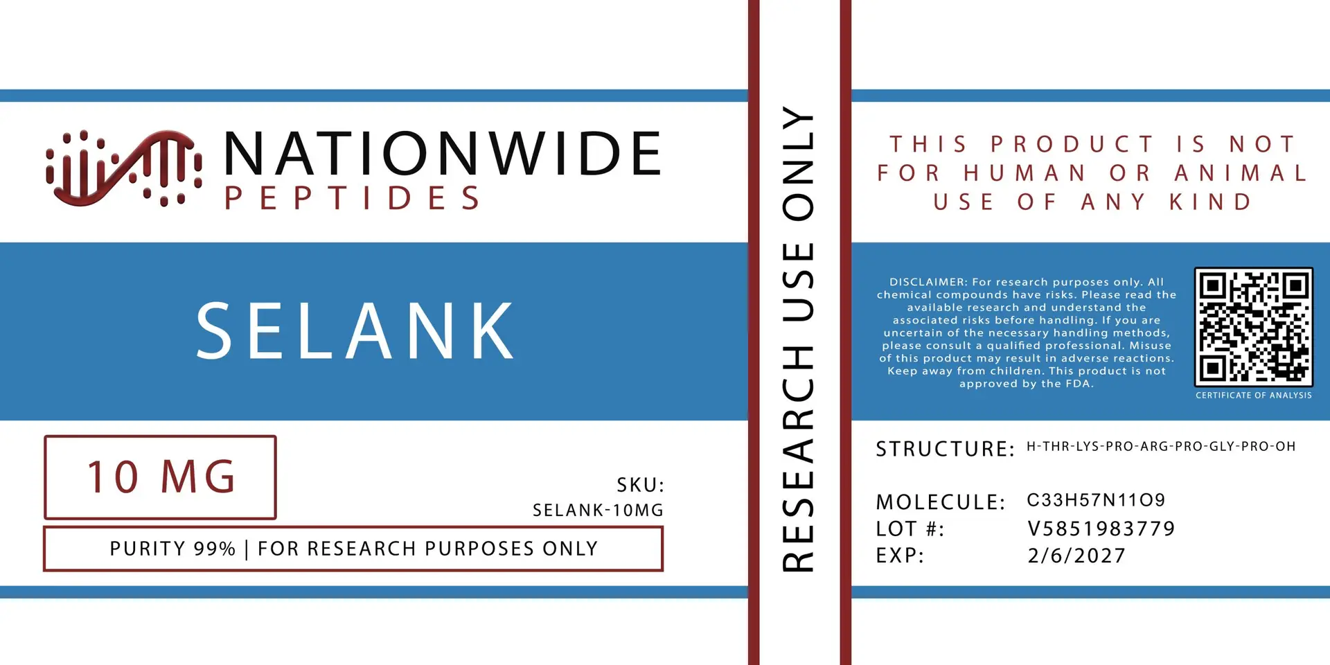 Selank is a synthetic heptapeptide developed by the Institute of Molecular Genetics of the Russian Academy of Sciences as an improved analog of the immunomodulatory peptide tuftsin (Thr-Lys-Pro-Arg). The addition of Pro-Gly-Pro at the C-terminus is associated with increased metabolic stability and potential for central nervous system penetration. This research-grade lyophilized powder is synthesized under strict quality controls and provided with full analytical documentation, for use in laboratory research settings only.