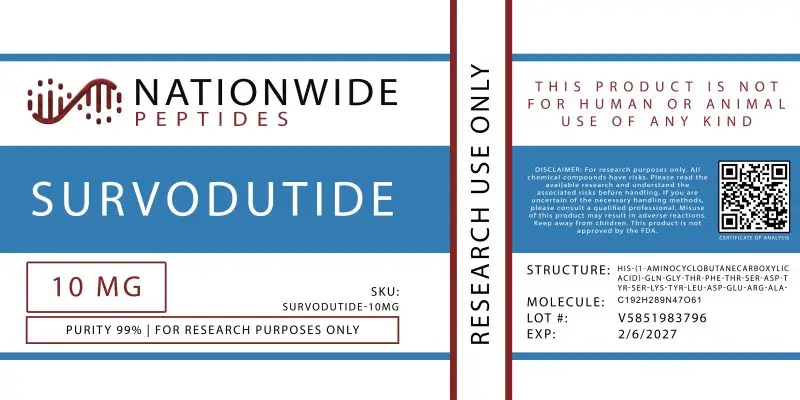 Survodutide (BI 456906) is an investigational unimolecular dual agonist developed by Boehringer Ingelheim (licensed from Zealand Pharma) that activates both the glucagon-like peptide-1 receptor (GLP-1R) and glucagon receptor (GCGR). Based on a modified glucagon backbone with C18 fatty acid acylation supporting once-weekly dosing, it is currently being evaluated in Phase 3 clinical trials (SYNCHRONIZE program) and represents an area of active incretin receptor research. This research-grade lyophilized powder is synthesized under strict quality controls and provided with full analytical documentation. For Research Use Only. Not for human use.